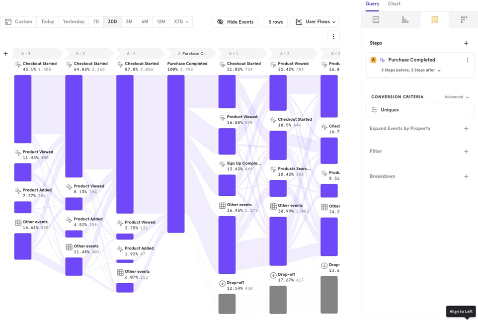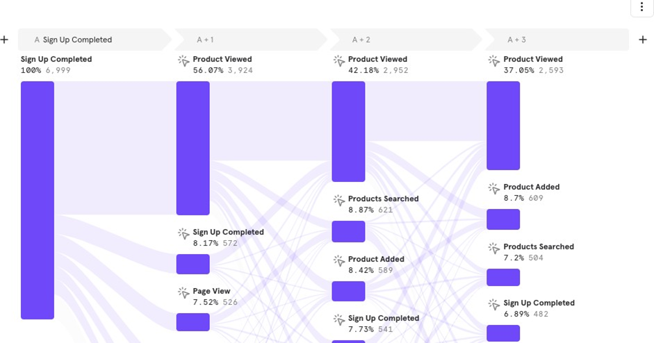 Example: You want to track users who completed Sign up, see their next 3 steps, and then understand how these users reach the Purchase Completed event. This helps identify steps users are likely to take to complete a purchase.