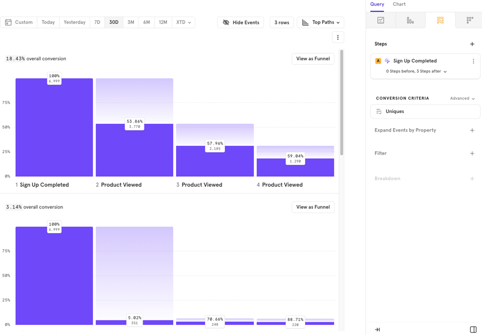 You can also dive deeper into specific paths by clicking View as Funnel, which will take you to the Funnels report for that flow.