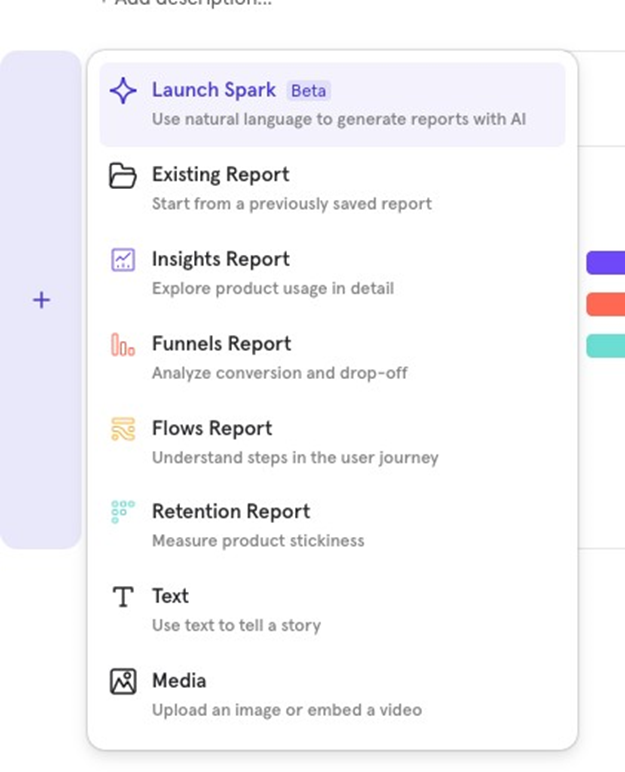 You can also add text and images to your dashboard. Hover on the left side, click the “+ˮ icon, and choose what to add.