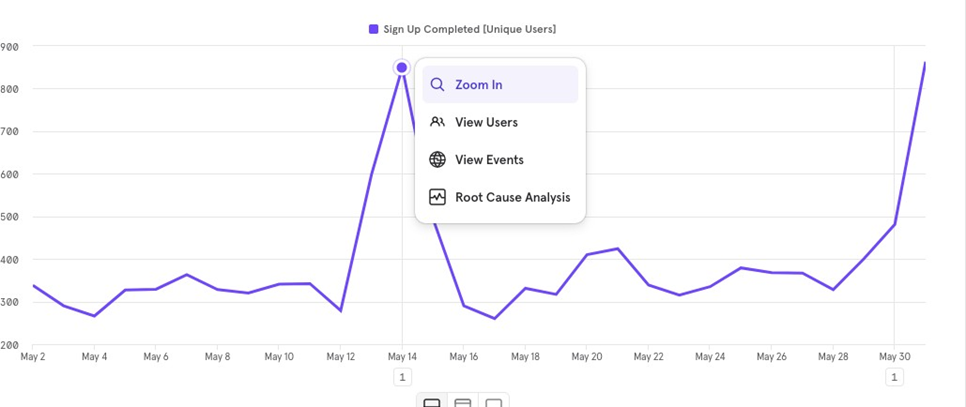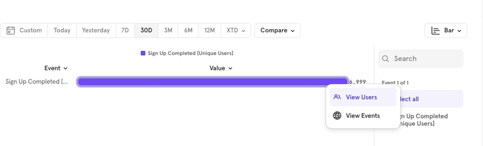 For example, if you create a funnel chart for Sign Up to Purchase Completed over the last 30 days, May 20 to June 20, the cohort will capture users from this period.