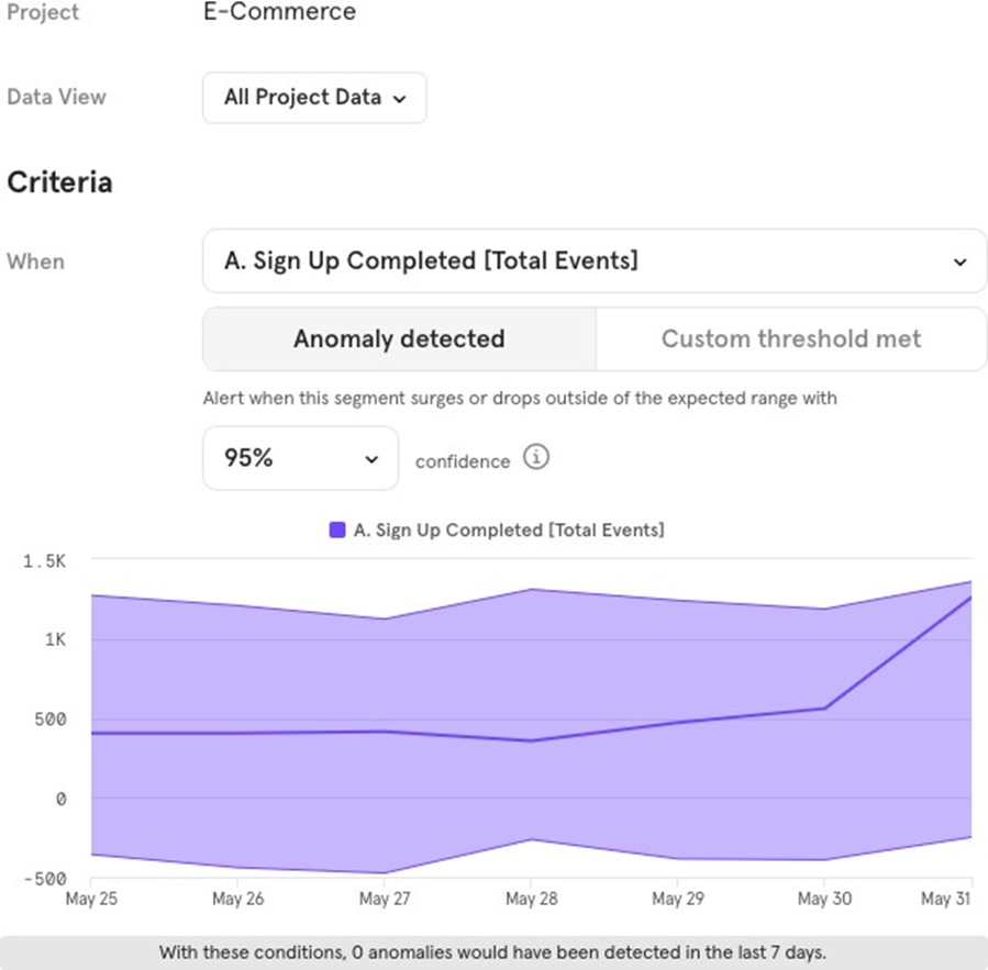Example: If signups exceed or fall below the confidence range, an alert is triggered. Based on the 95% confidence interval, the purple range shows the upper and lower boundaries for the alert. If the number of sign-ups falls outside this range, an alert will be triggered.
