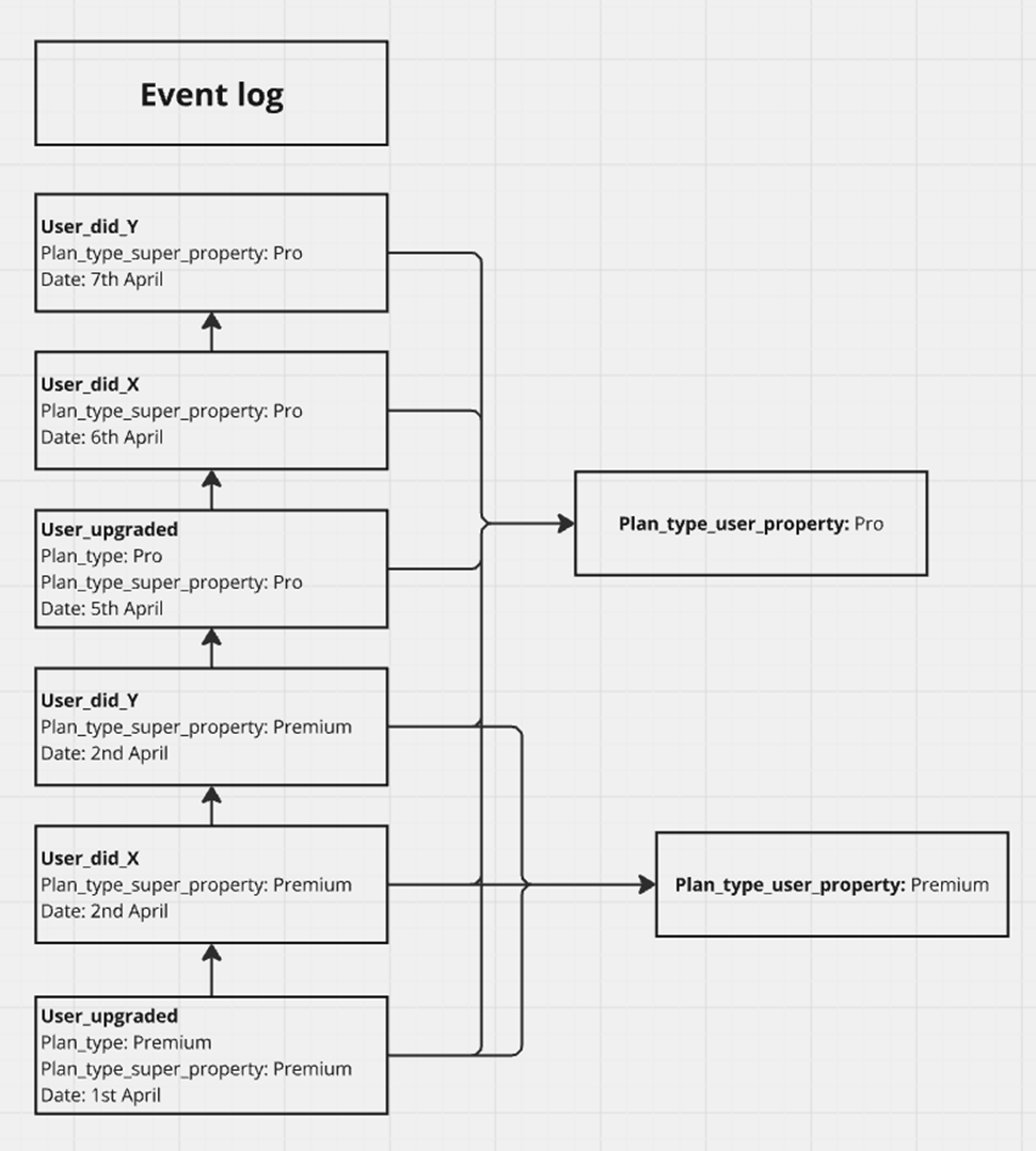 The event "user_upgraded" is triggered. The property "plan_type" is associated with this event, set as an event (plan_type), profile (plan_type_user_property), and super (plan_type_super_property) property.