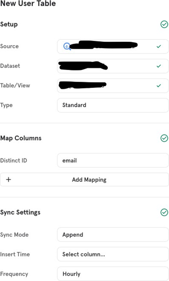 The One-Time mode loads your data into Mixpanel only once, with no ability to send incremental changes afterward. This is recommended when you’re transferring data from a temporary warehouse that wonʼt be updated later.