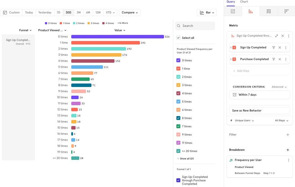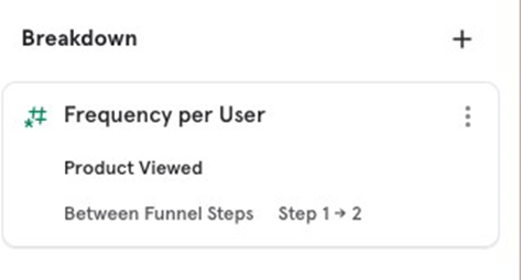 In this case, you can break down the Sign Up to Purchase Completed funnel by choosing Frequency per user and selecting Product Viewed as the event.